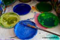 Adultes et enfants, choisissent leurs couleurs autour de la table-palette et peignent spontanément .