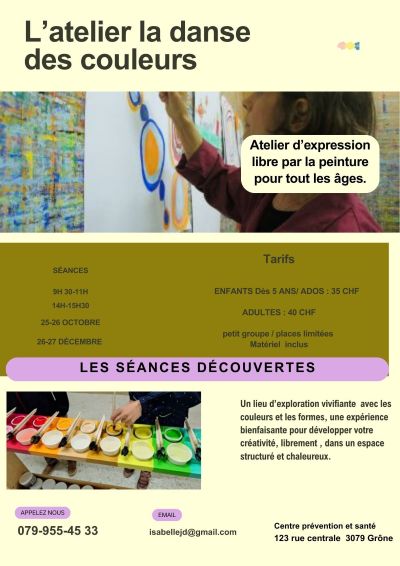 Information : L’ Atelier la danse des couleurs est fermé durant les vacances sauf pour les séances découvertes.