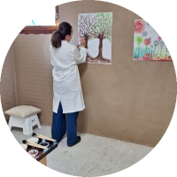 La praticienne prépare son atelier avant chaque séance : Tenue des peintures avec l’eau dans les godets , vérification des pinceaux Petit-Gris, recharge des feuilles de papier.