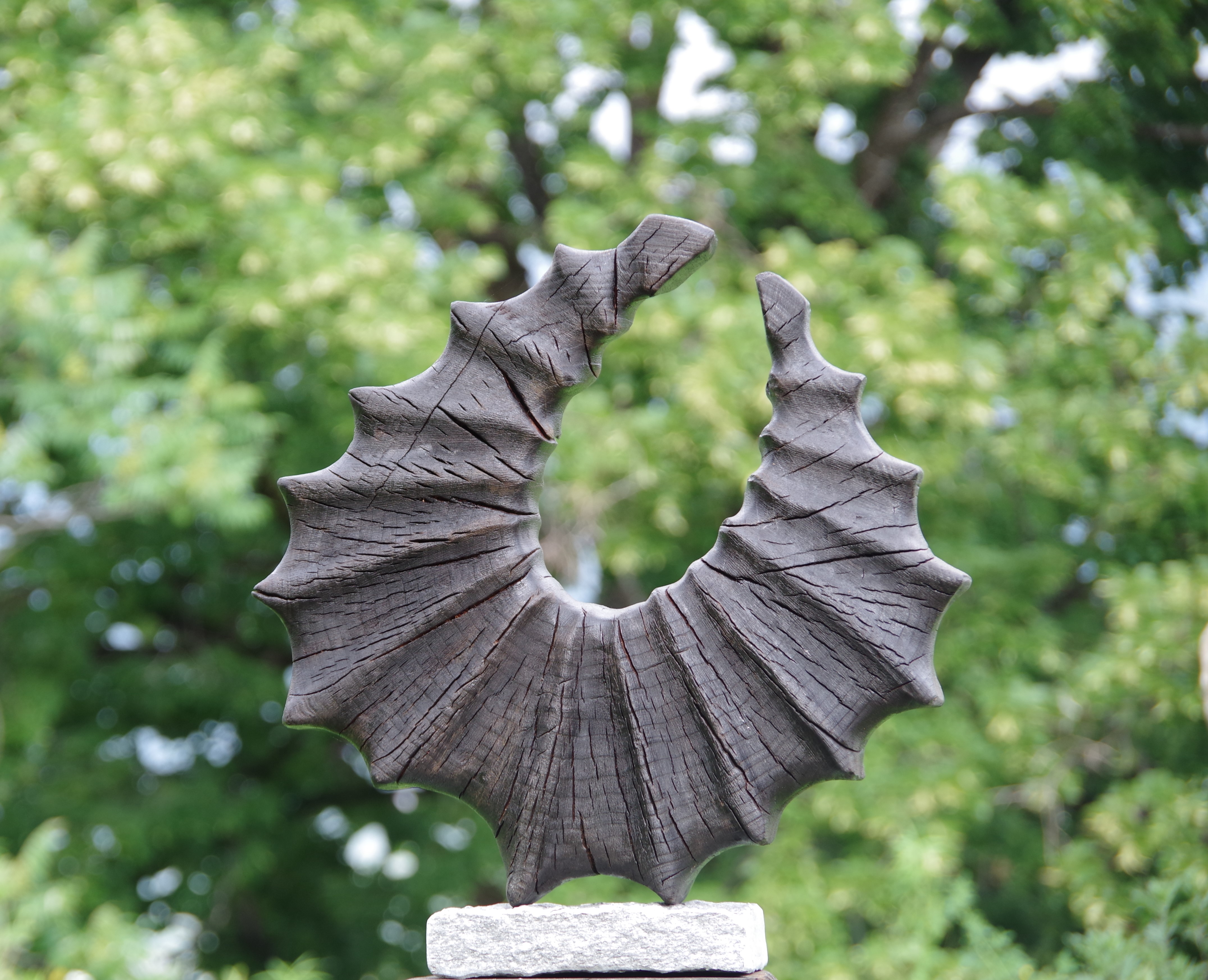 Saule sculpté 2 faces, brûlé. Socle schiste