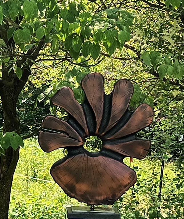 Florale Cerisier sculpté 2 faces, brûlé, pigments. Socle acier et granit. "Contrastes, formes et textures". 60 x 40 cm Disponible
