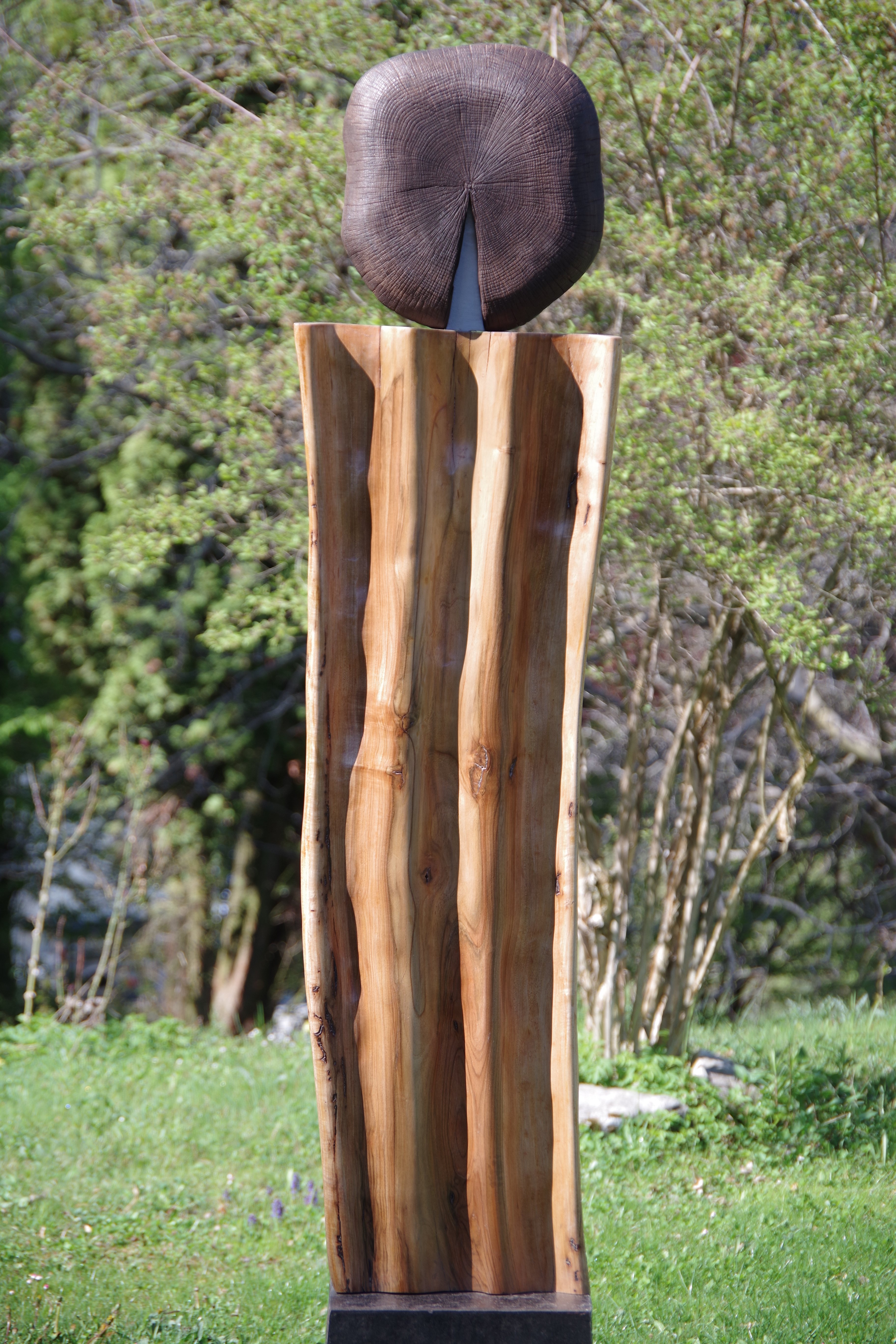 Présence Noyer et chêne. Sculpture en draperie 2 faces. Socle granit noir. Sculpture d’intérieur. "Une fois encore, la forme tout d’abord de la draperie m’a oserais-je dire "suggéré" de lui ajouter une tête ... et la Présence s’est imposée !" 180 x 50 cm Disponible