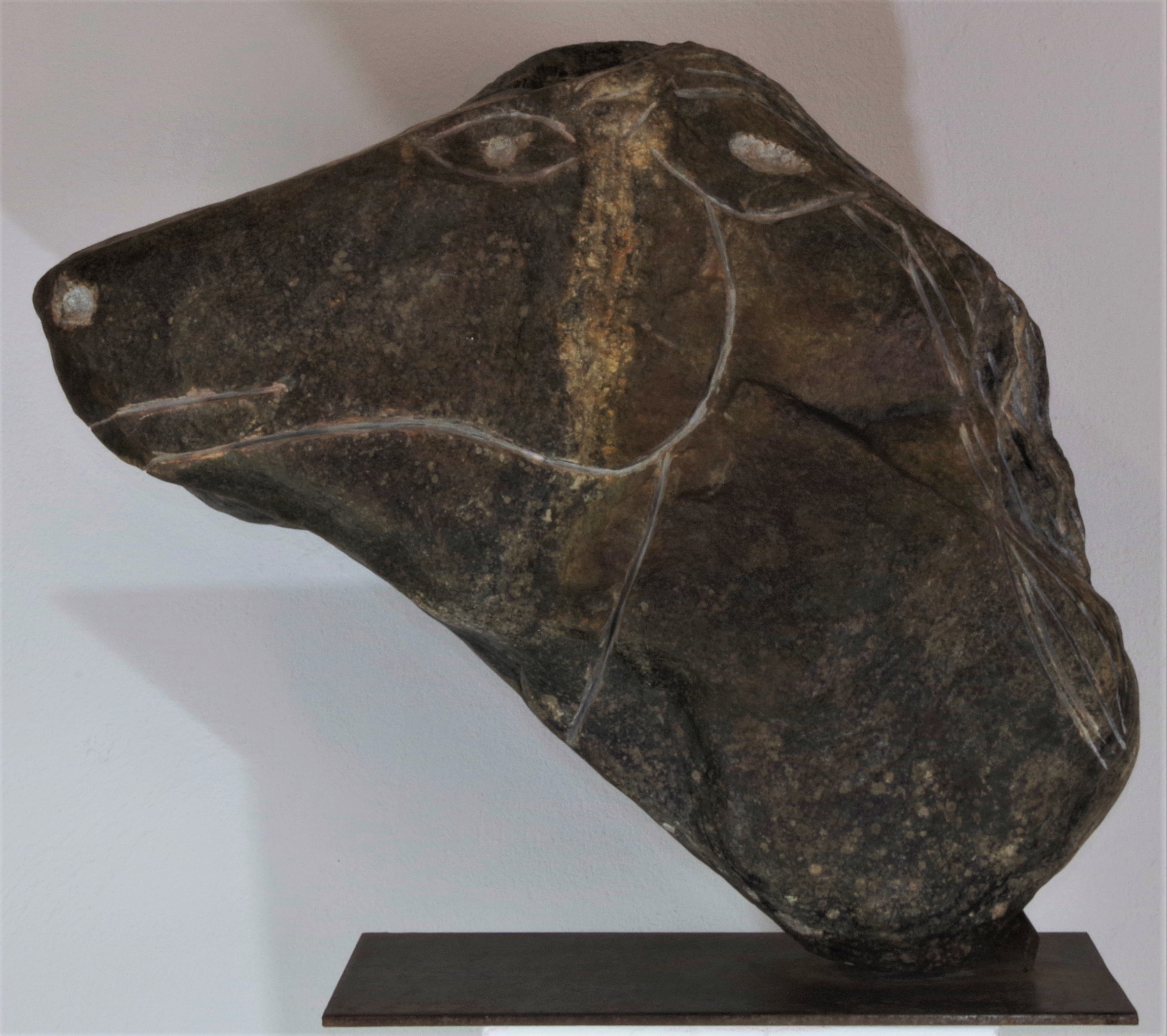 Rupestre Bloc de Quartzite, 2 faces sculptées, socle acier rouillé "Ressentir, être à l’écoute de ce bloc en apparence inerte ... Puis une force me saute aux yeux et il ne reste plus qu’à la souligner ou plus tôt la suggérer ... " 60 x 50 , poids 80kg cm Disponible
