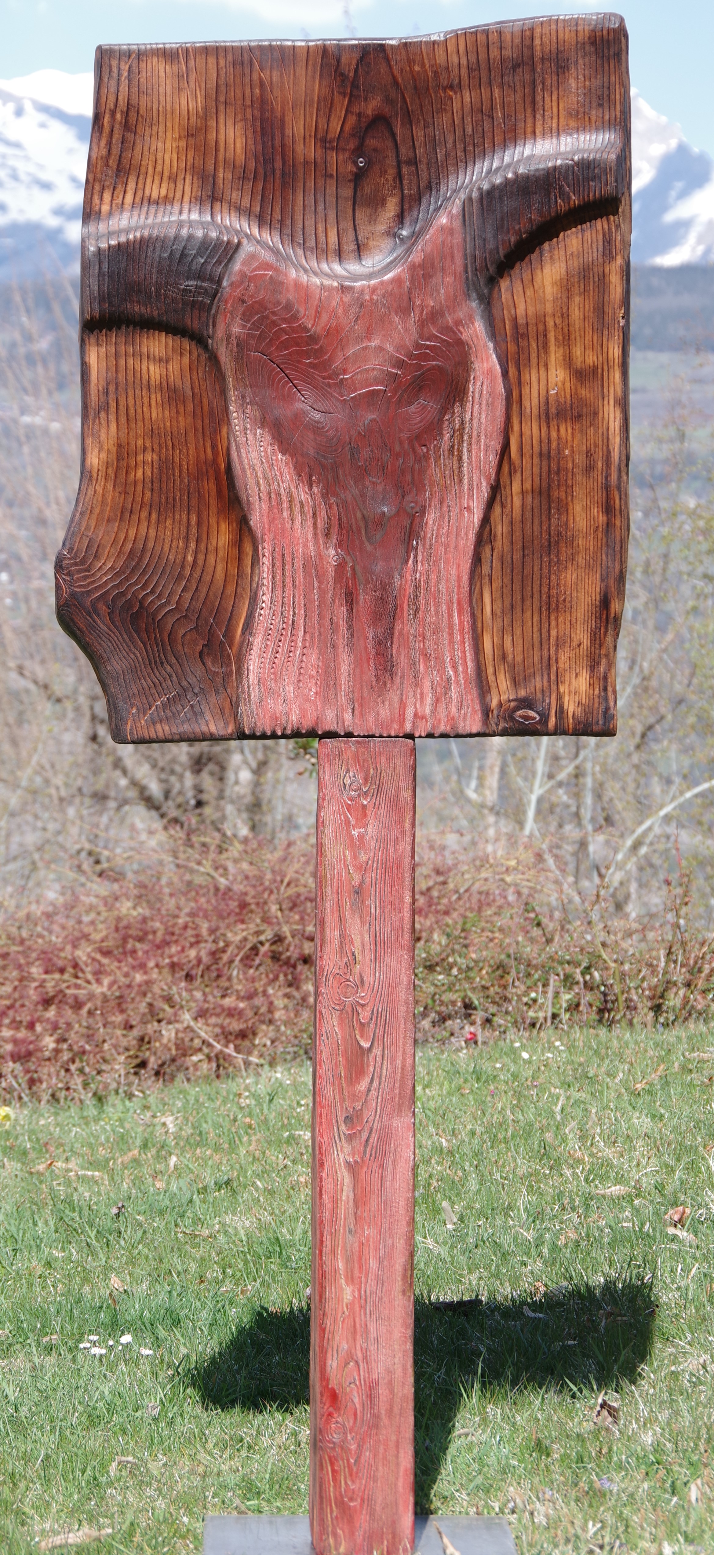 Sylvebarbe Cèdre et mélèze. Socle acier. Sculpture d’intérieur. "Destiné à une autre sculpture, ce panneau de cèdre m’a très vite révélé sa vraie nature qui n’attendait que mon regard puis peut-être le vôtre pour lui donner corps ..." 170 x 60 cm Disponible